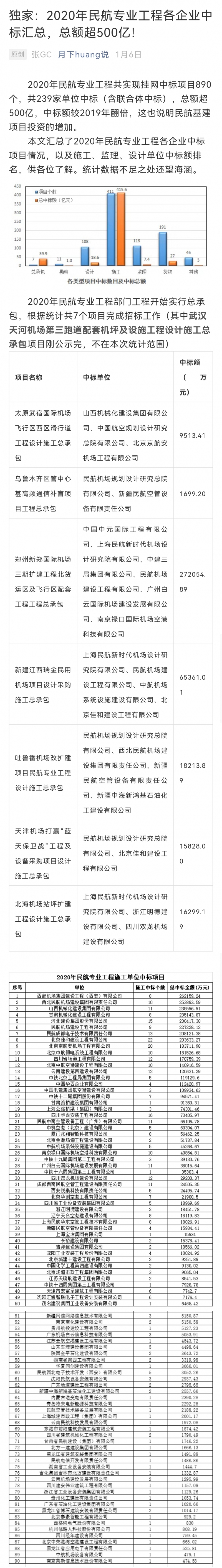 2020年民航專業工程共實現掛網中標項目890個,共239家單位中標(含聯合體中標),總額超500億。我公司民航專業工程中標項目共8個,中標總金額235143.87萬元,位居全國第四。