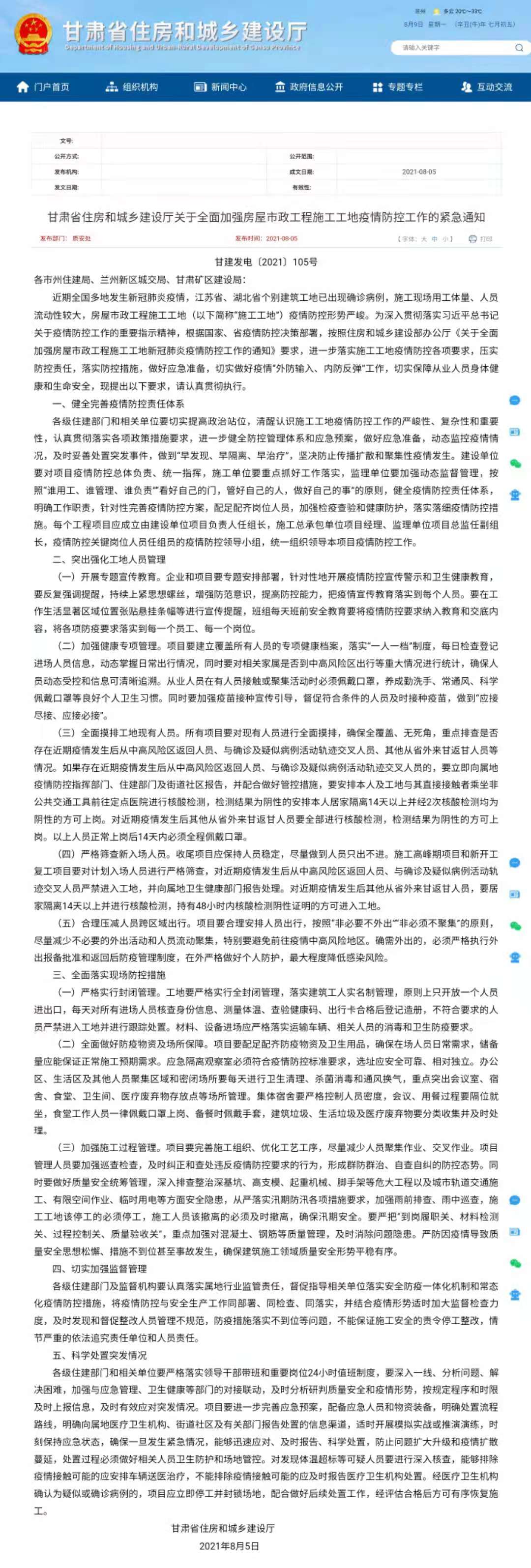 為深入貫徹落實(shí)習(xí)近平總書記關(guān)于疫情防控工作的重要指示精神,根據(jù)國家、省疫情防控決策部署,按照住房和城鄉(xiāng)建設(shè)部辦公廳《關(guān)于全面加強(qiáng)房屋市政工程施工工地新冠肺炎疫情防控工作的通知》要求,確保安全生產(chǎn)和正常施工生產(chǎn)秩序,現(xiàn)將《甘肅省住房和城鄉(xiāng)建設(shè)廳關(guān)于全面加強(qiáng)房屋市政工程施工工地疫情防控工作的緊急通知》轉(zhuǎn)發(fā)給你們,請(qǐng)各單位遵照?qǐng)?zhí)行。